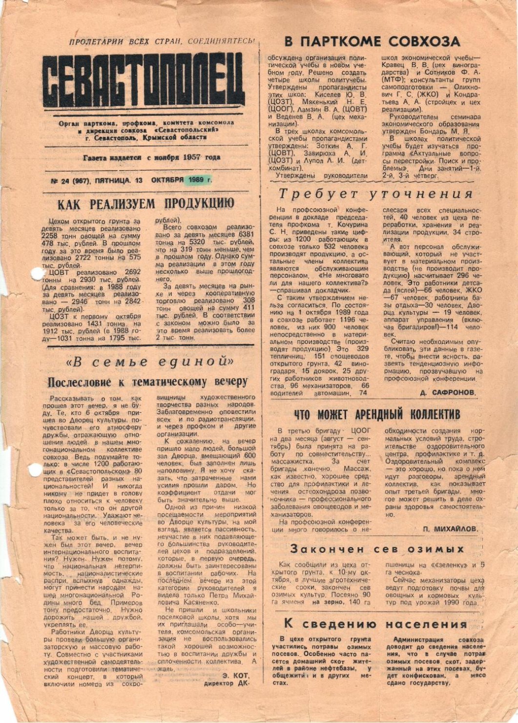 Газета «Севастополец». №967 (24). 13.10.1989. С. 1